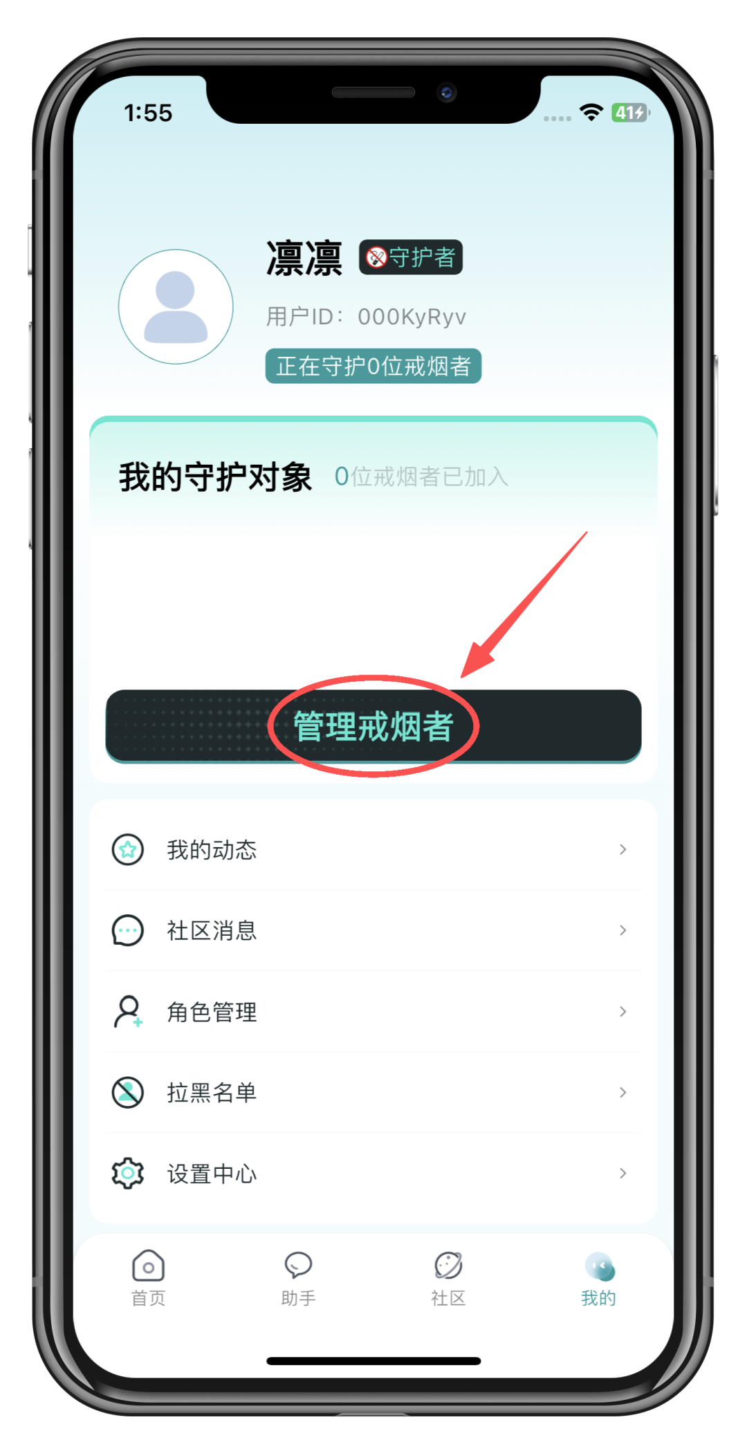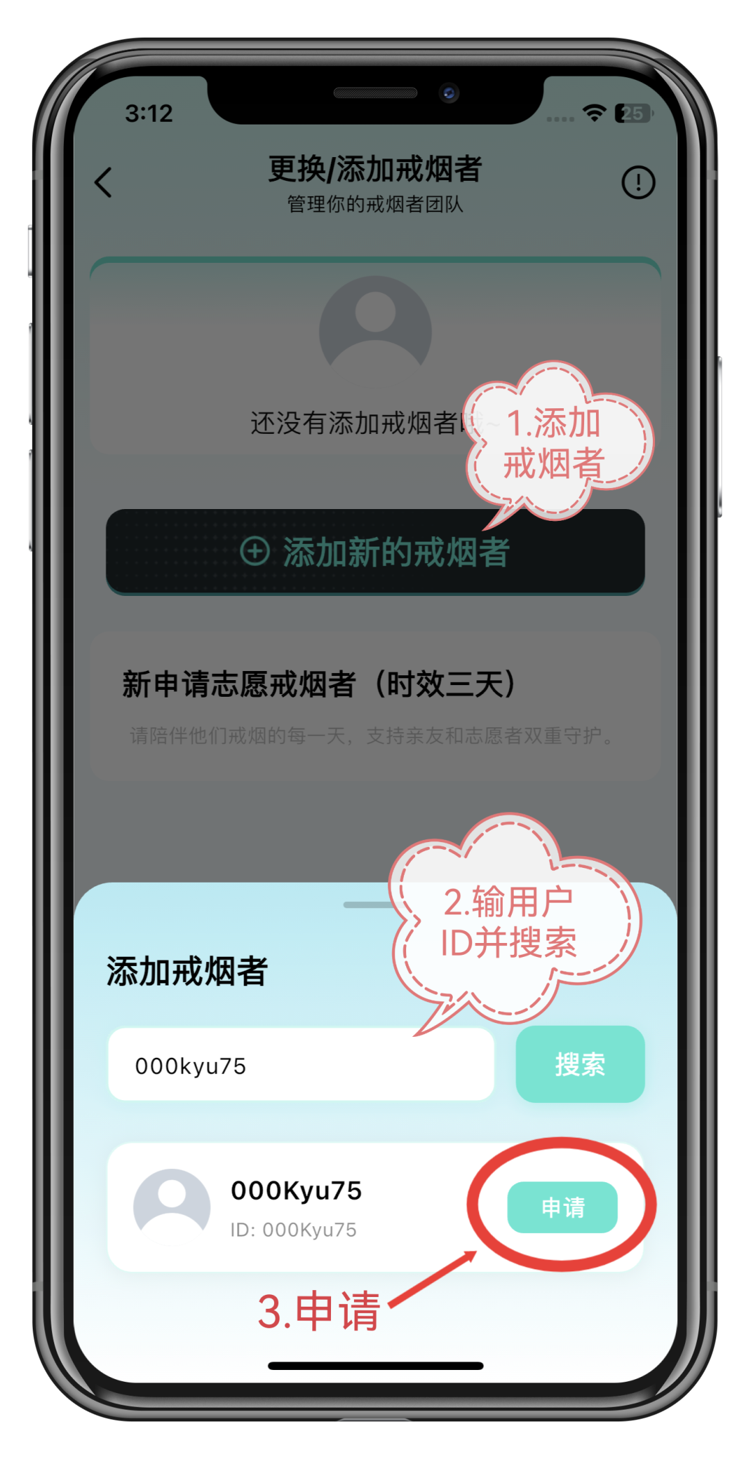 我的→管理戒烟者→添加新的戒烟者→输入对方用户ID→搜索并申请
