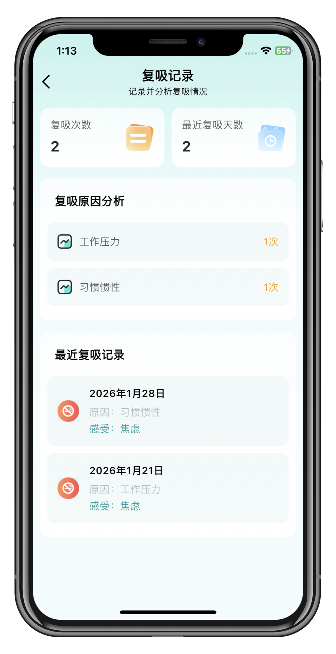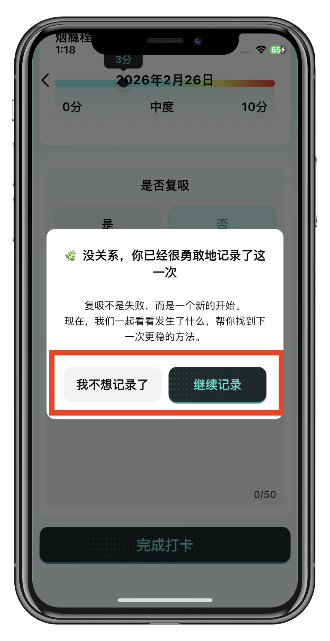「每日打卡」中如实记录「是否复吸」,选「继续记录」或「不想记录」完成打卡,系统会帮你分析诱因、感受。复吸不是失败,是为成功收集“情报”。