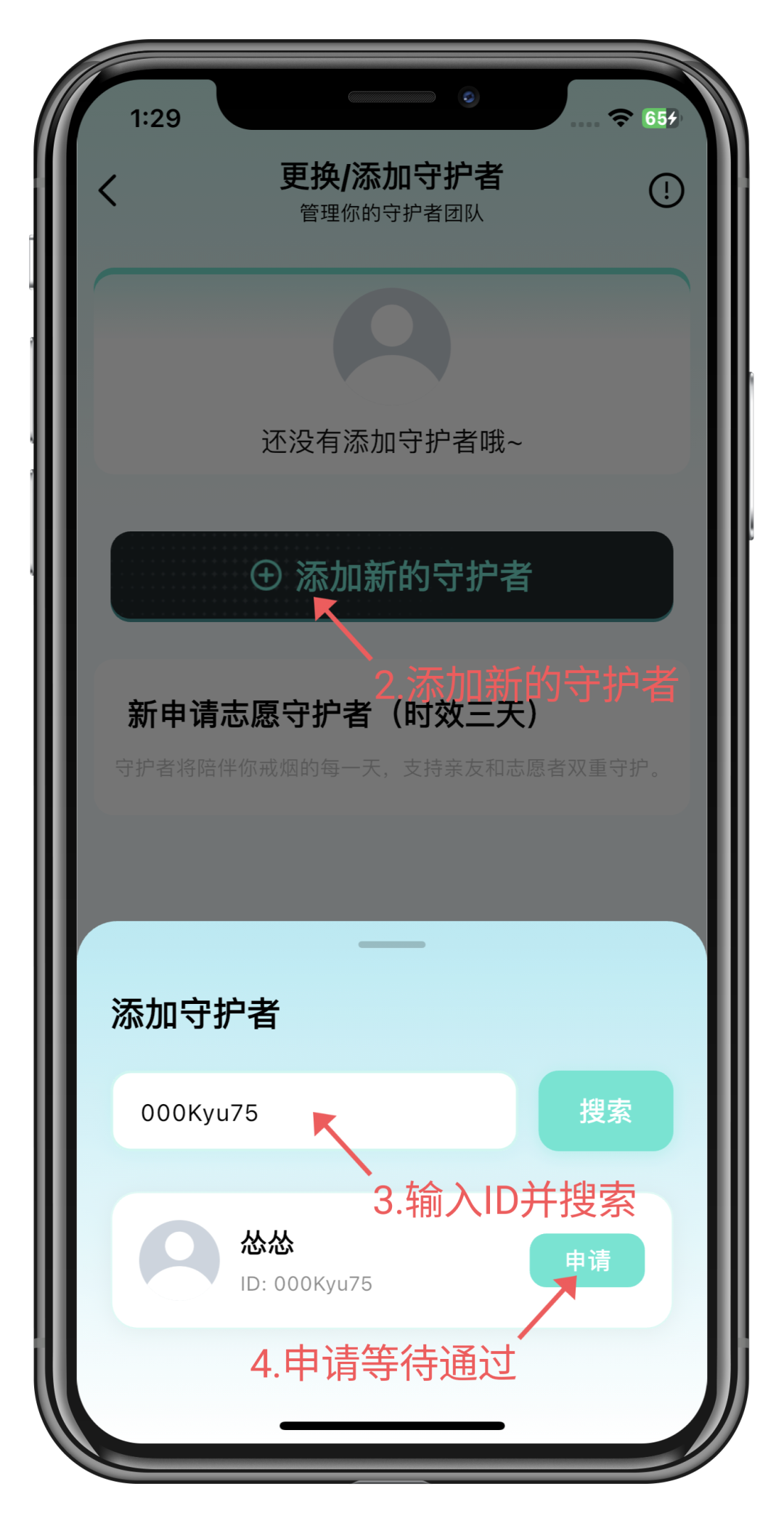 戒烟者进入「我的」→「管理守护者」→点击「添加守护者」→输入ID并搜索确认→提交申请等待亲友通过