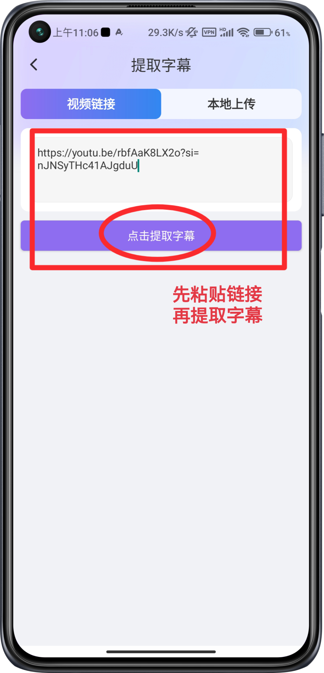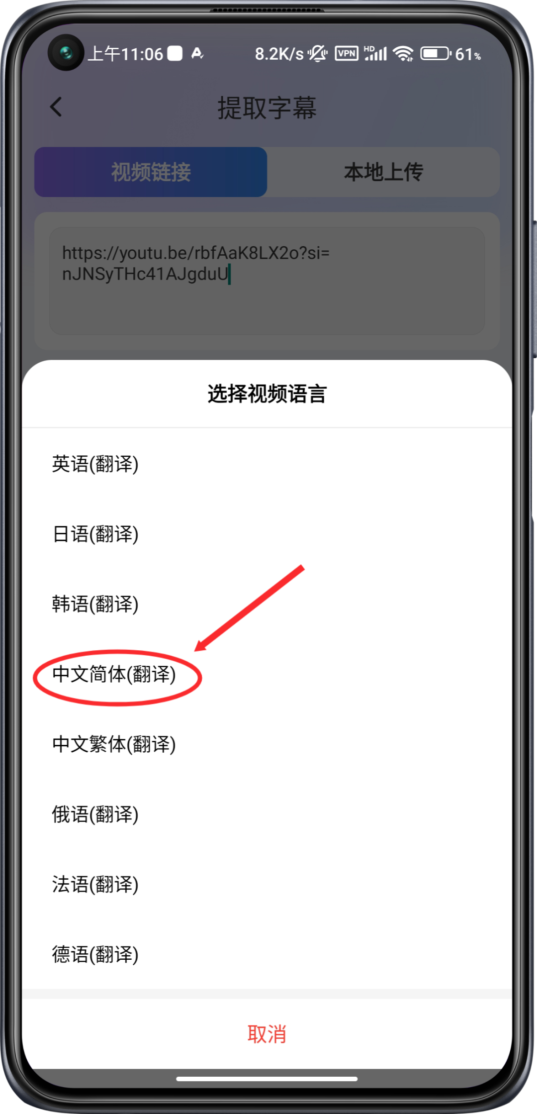 粘贴链接 → 点击「提取字幕」→ 选择翻译语言