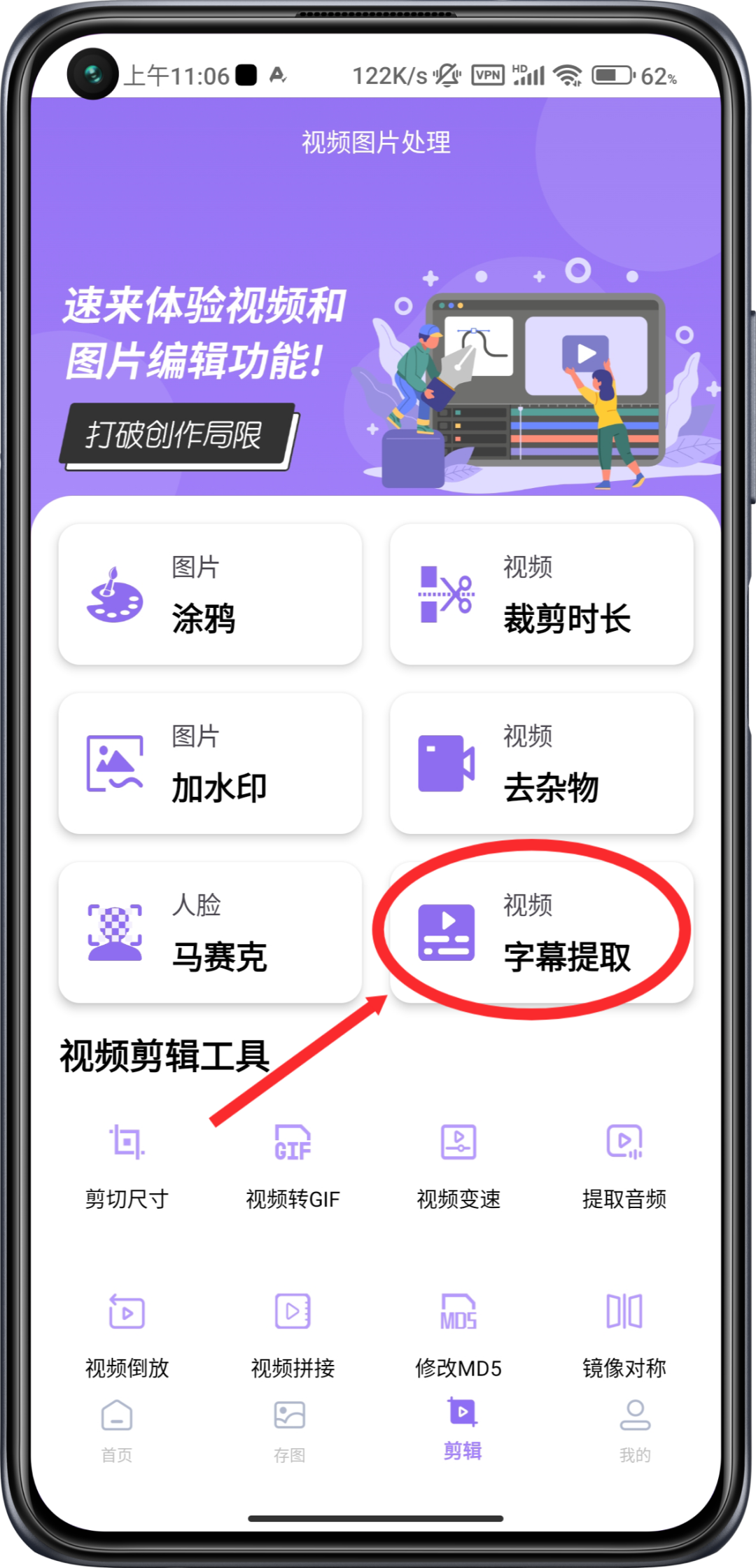 打开「存了个图」→「剪辑」→「视频字幕提取」